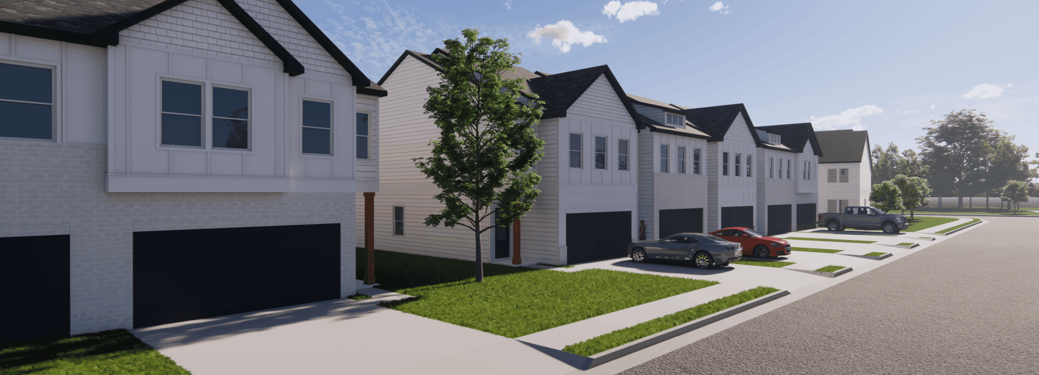 Home interiors will include stainless steel appliances, wood plank-style flooring, nine-foot ceilings, quartz countertops, subway tile backsplashes, custom white cabinetry, city loft walls, oversized windows, smart thermostats, walk-in closets, double vanities in bathrooms, ceiling fans, in-home washers and dryers, and EV charging capabilities in each garage.